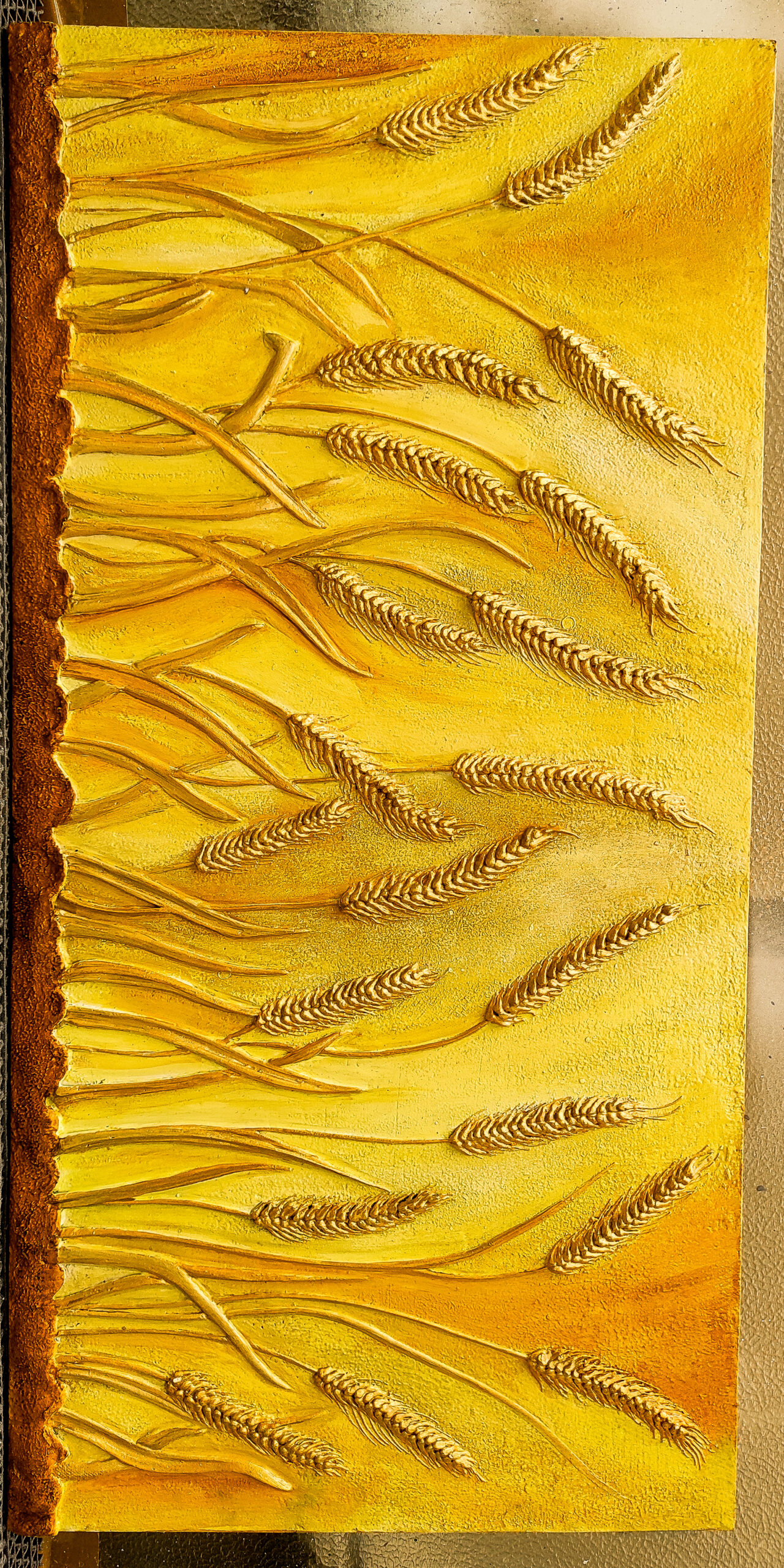 “Golden wheat stalks crafted with textured paste on an MDF board, accented with golden leaves against a warm yellow and golden background.