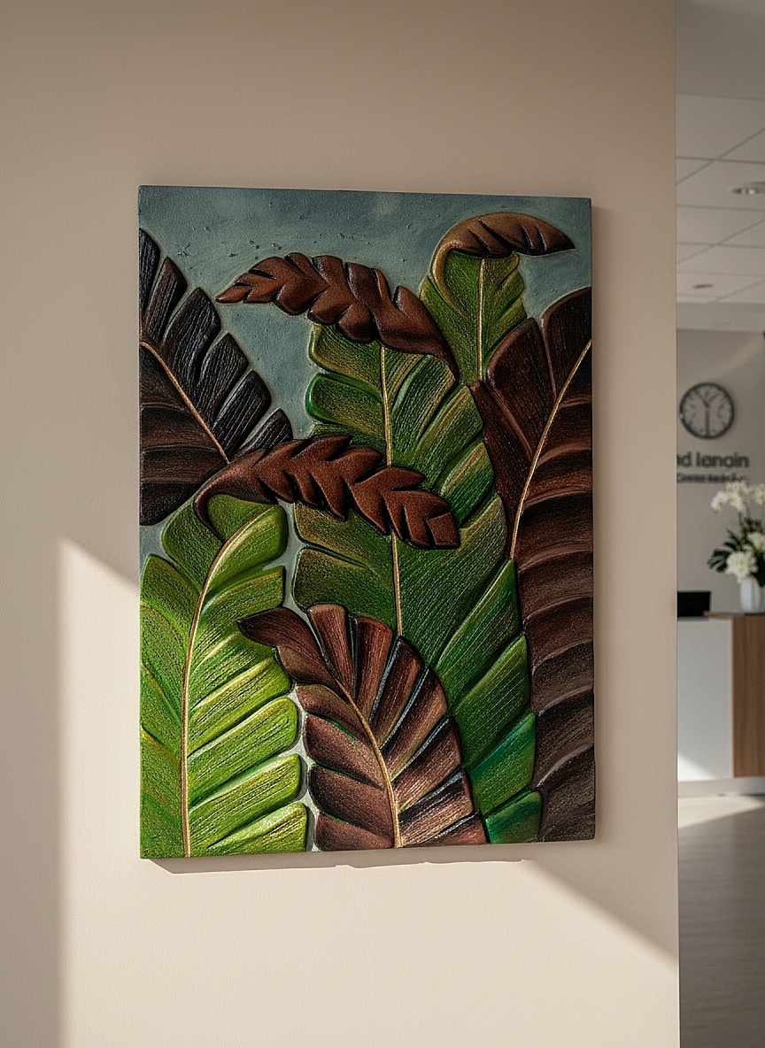 This beautiful handcrafted artwork is created on a wooden board, featuring banana leaves designed with rich texture and elegant color blending. The composition combines light green, dark green, dark wine red, brown, and golden tones, giving the piece a warm yet refreshing natural appeal. The grey background enhances the raised 3D effect, making each leaf stand out with depth and dimension. Ideal for living rooms, offices, or as a thoughtful gift, this painting brings the calm and freshness of nature into modern spaces.