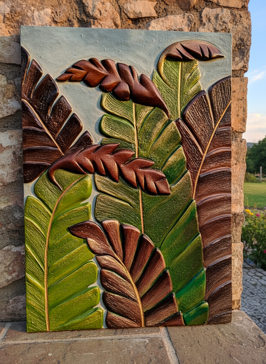 This beautiful handcrafted artwork is created on a wooden board, featuring banana leaves designed with rich texture and elegant color blending. The composition combines light green, dark green, dark wine red, brown, and golden tones, giving the piece a warm yet refreshing natural appeal.