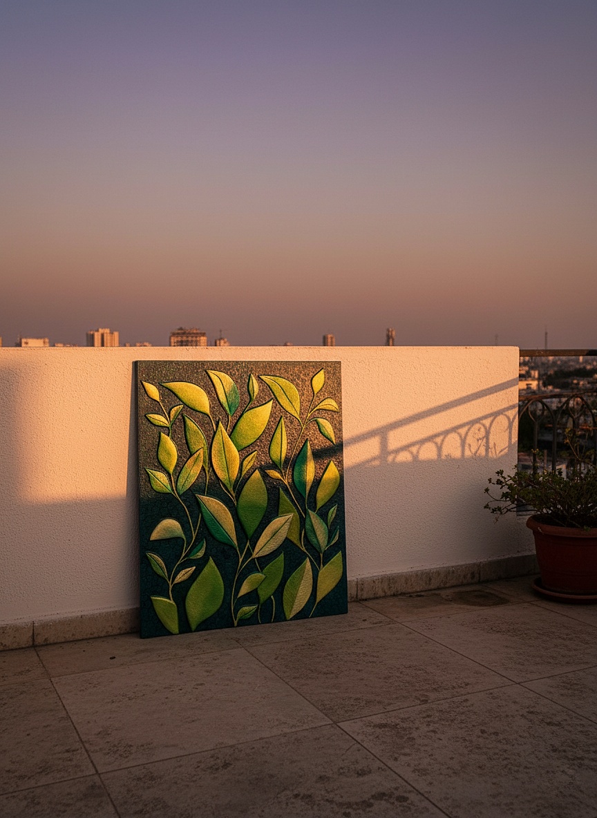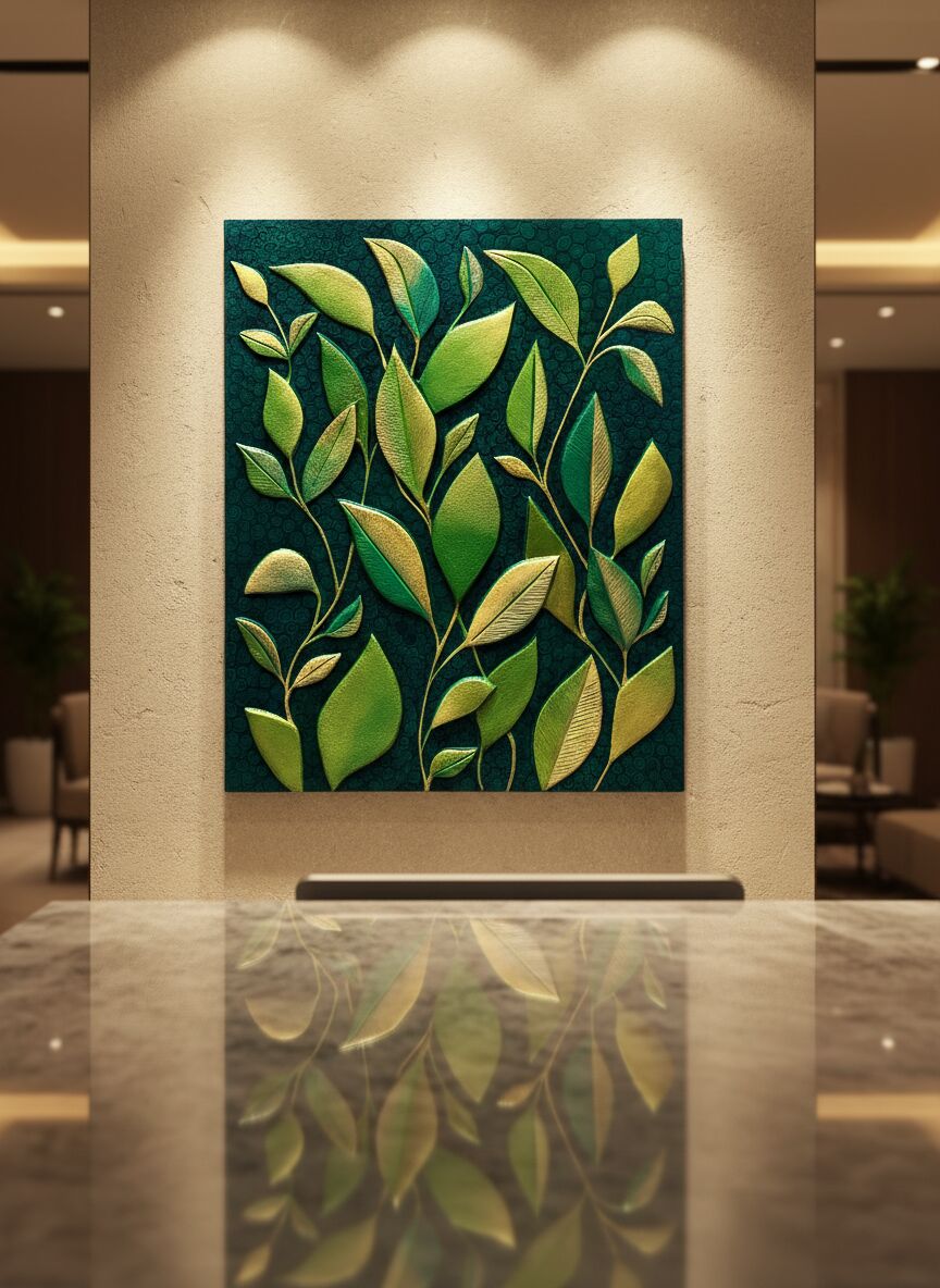 This striking textured artwork is handcrafted on a wooden board using smooth acrylic texture paste, giving it a unique 3D effect and rich tactile feel. The design features vibrant green leaves with golden accents on a dark green background, bringing freshness, elegance, and modern artistry to any space. Ideal for living rooms, offices, or as a thoughtful gift, this piece seamlessly blends nature and creativity.